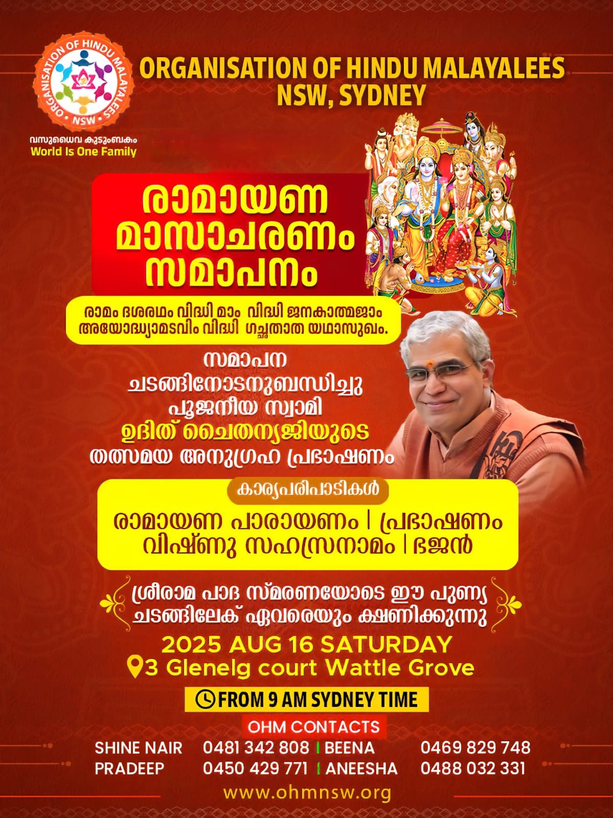 Attukal Pongala is a 10-day religious festival celebrated at the Attukal Bhagavathy Temple in Thiruvananthapuram in the Indian state of Kerala. On the ninth day there is a huge gathering of millions of women on the temple surroundings. This year Organisation of Hindu Malayalees NSW, celebrated Attukkal Pongala on Sunday 9th March 2025 from 8.30am at Minto temple
